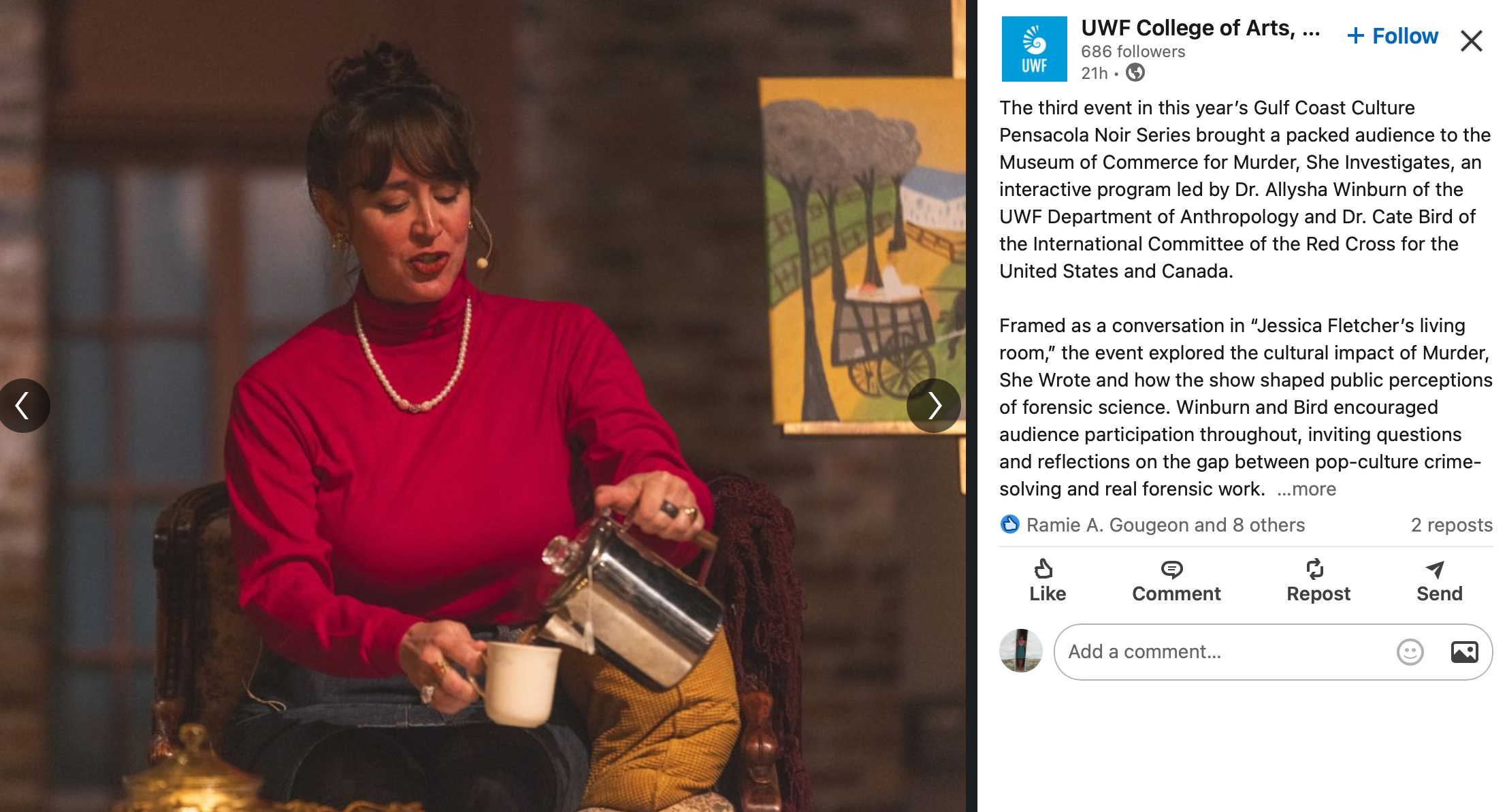 UWF’s College of Arts, Social Sciences, and Humanities recently welcomed my dear friend and colleague Dr. Cate Bird of the ICRC to Pensacola to co-host one of Dean Earle’s Gulf Coast Culture Events. Our contribution to this year’s series, themed “Pensacola Noir,” centered around none other than the fabulous Jessica Fletcher: the iconic, ever-meddling avocational sleuth portrayed by the late, great Angela Lansbury on the 80’s-90’s-era TV show Murder, She Wrote. Our talk (nicknamed Murder, She Investigates!) was a blast—well attended by original and newly minted fans alike. Thanks to the Dean, his team, Dr. Bird, and especially J.B. Fletcher for making this dream come true! <3 Oh, and special thaks to Mark Winburn, who co-authored the book chapter that started it all. ;)